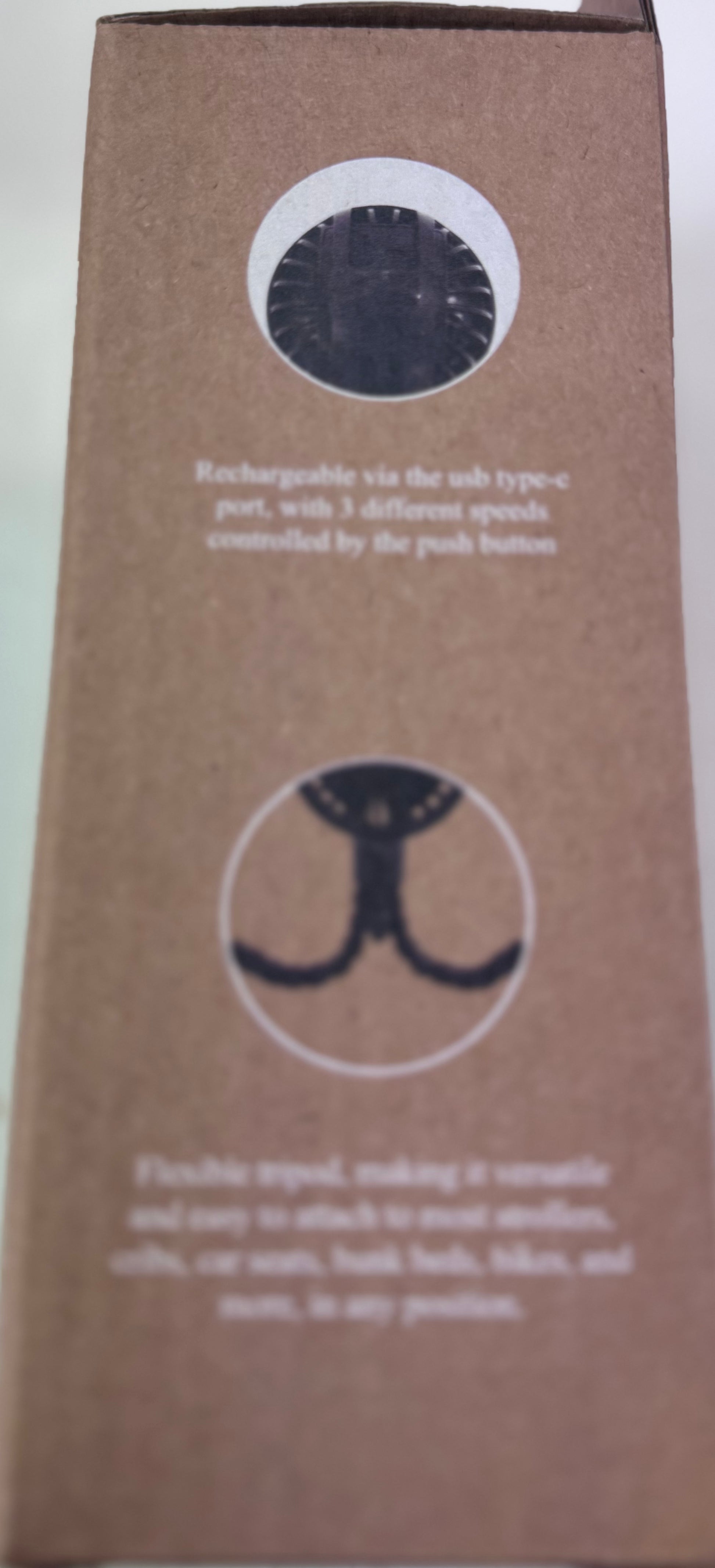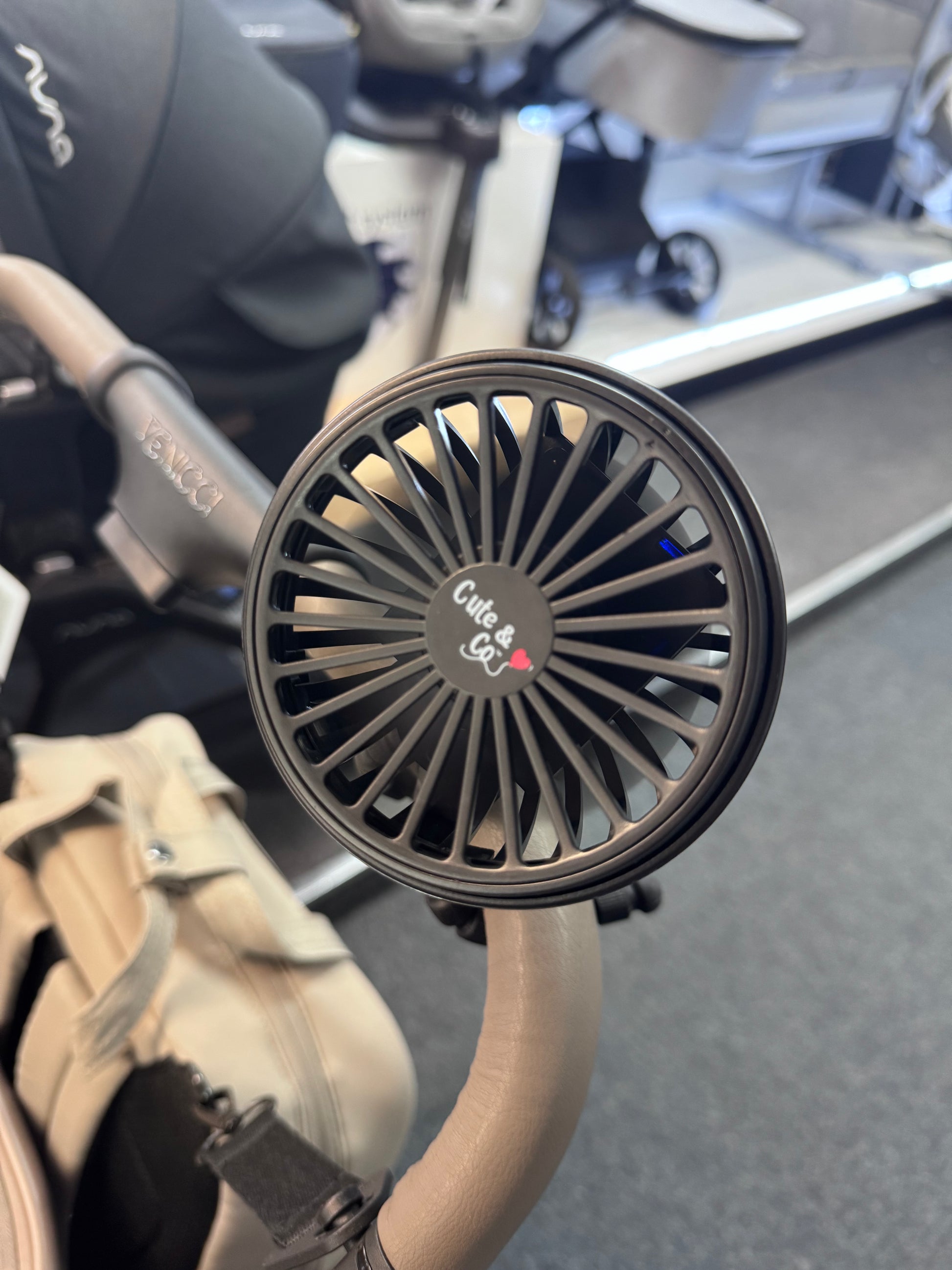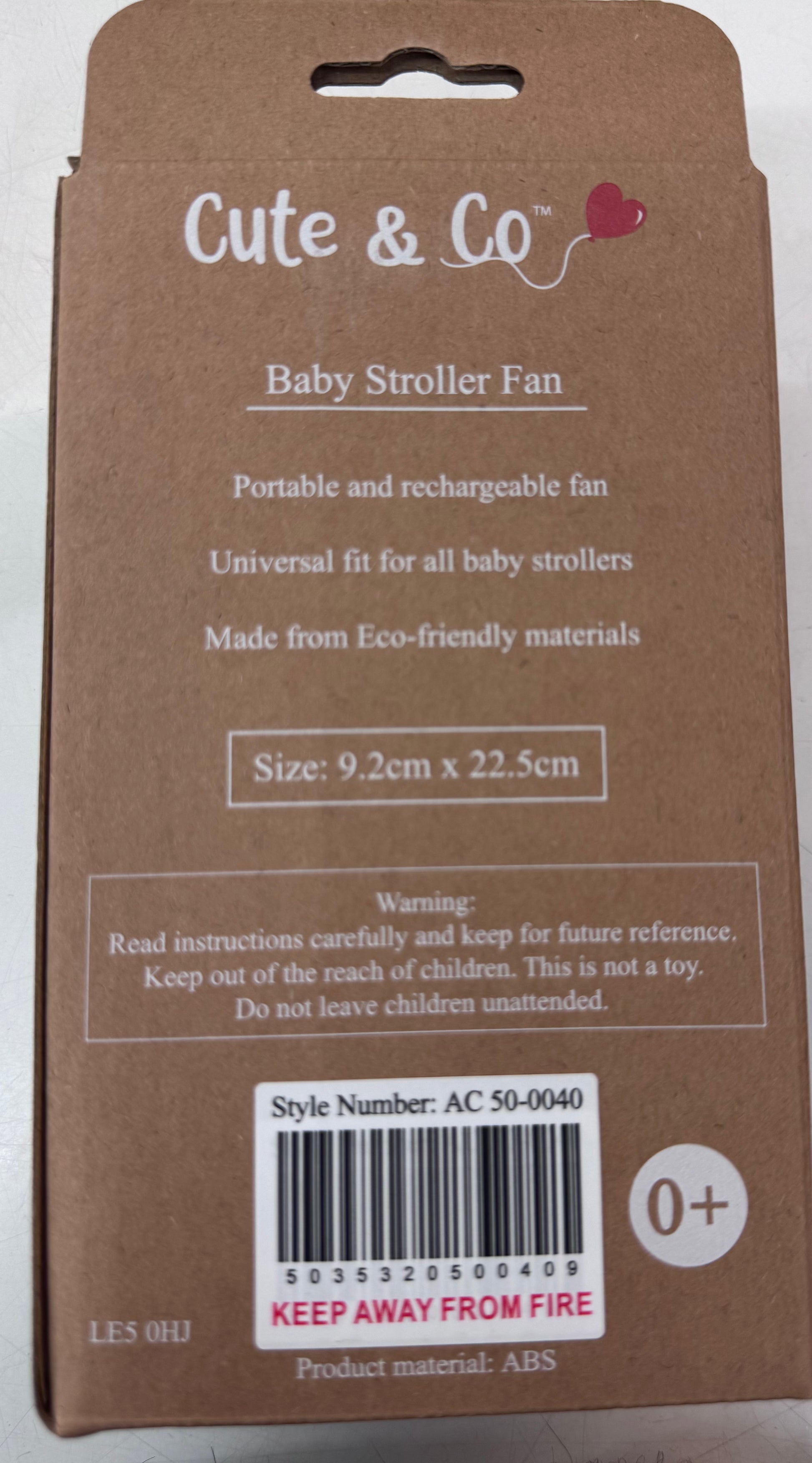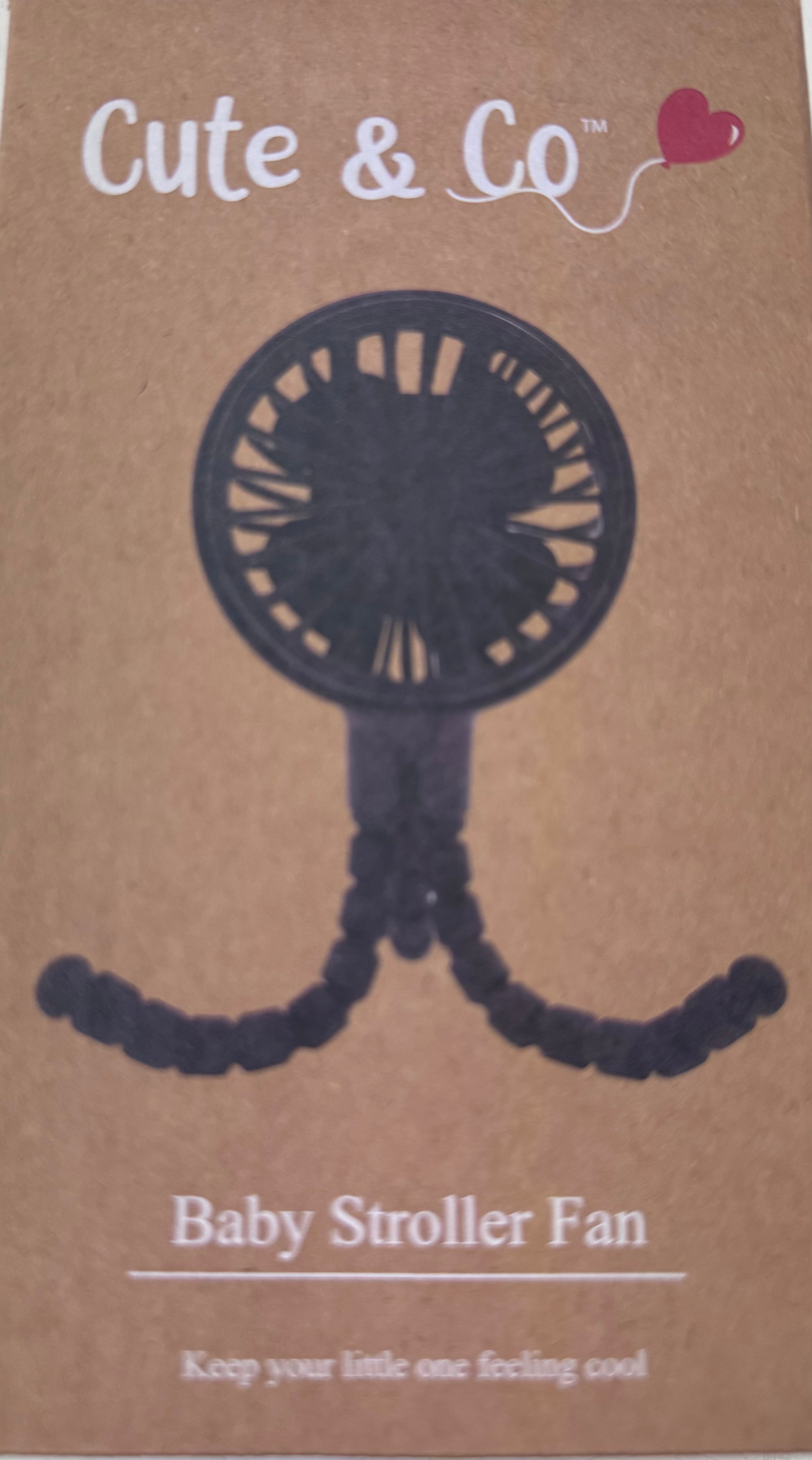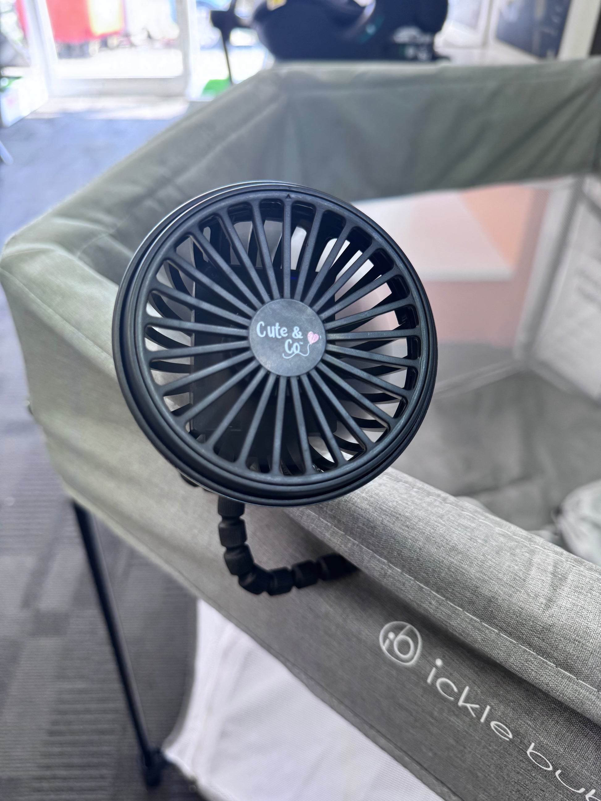 Cute & Co Baby Stroller fan. Portable and rechargeable fan. Universal fit for lots of items. USB charger cable Inc
