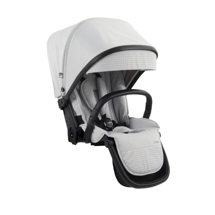 While removing and refitting the tandem seat is both easy and ergonomic, simply reach and pull up the strap nestled between the seat and backrest and lift. The seat also has a full 'lie flat recline in world facing only making it suitable from birth, a 5 point safety harness with both shoulder pads and a headrest for extra comfort, unzip the extendable canopy featuring UV 50+ protection with colour changing reactive UPF tag alerts you to UV levels for added peace of mind, a pull out sun visor and ventilation net for hot summer days.