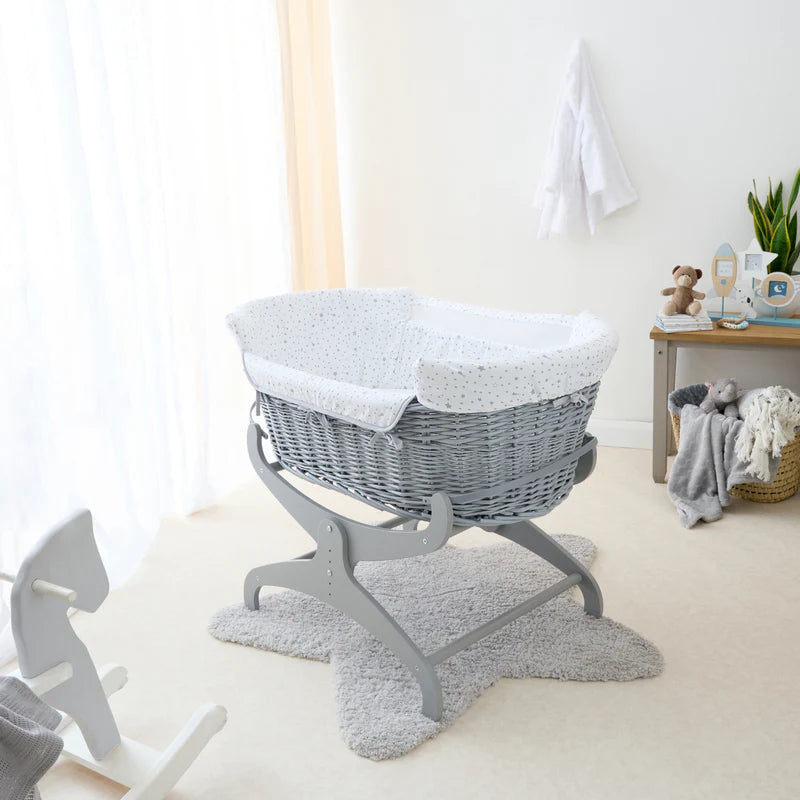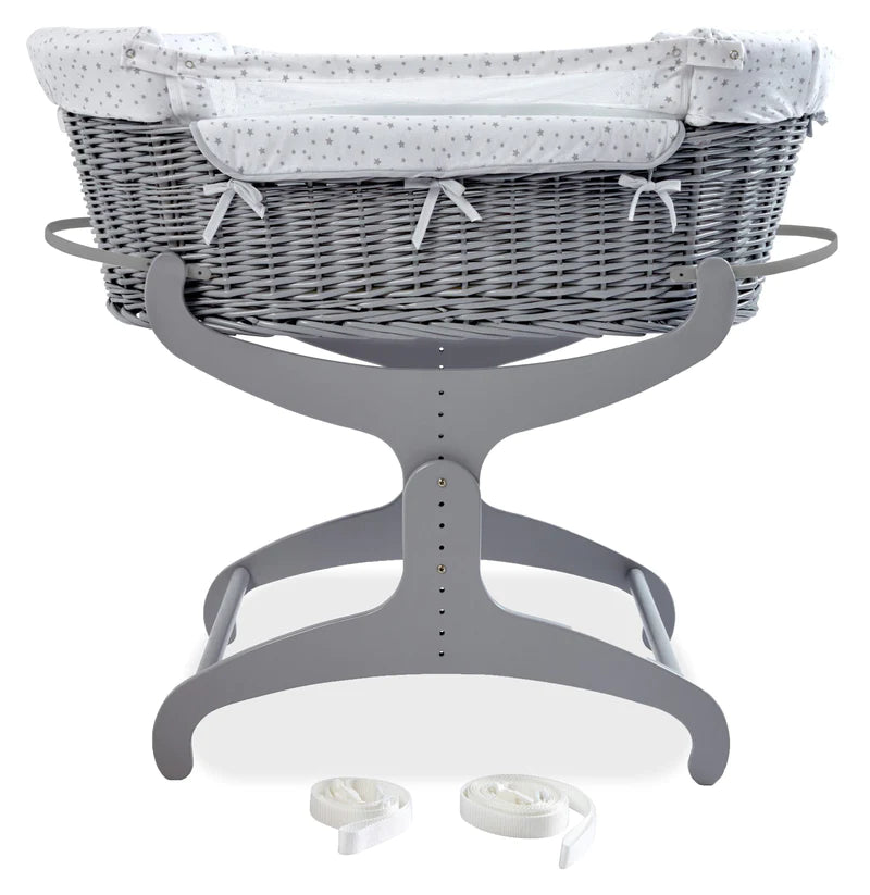 Made from all-natural, handwoven grey wicker, our revolutionary Bedside Crib sits proudly and securely on a fully adjustable wooden stand that positions easily next to any bed. The matching stand has 10 height settings so it can be placed at the perfect height beside your bed, level with the top of your mattress. What's great is that it can also be used as a standalone crib in your nursery and around the house!