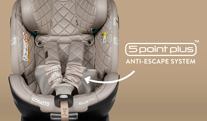 This car seat has had extensive crash and safety testing as part of the latest R129 / i-Size standard. The i-Size standard takes testing further with mandatory side-impact and roll-over testing - all using the latest crash test dummies - to help create safer car seats. All in All Ultra Rotate i-Size is tested beyond the standard R129 speed requirements, in-line with ADAC levels of testing All in All Ultra Rotate i-Size features a pop out premium SIPS (side impact protection system), that will absorb forces in the event of a side-impact collision. Deep side-wing panels and energy absorbing foam padded insert provide side-impact protection. It also has Cosatto’s exclusive 5 point plus anti-escape system, for added safety.