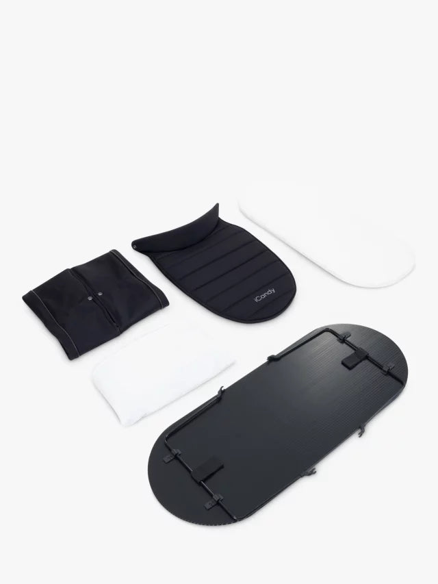 In the package, parents will receive the fabrics required to create the second carrycot. It includes an apron, carrycot apron, carrycot fabric, mattress, inner lining and bumper bar. Frame not included.
